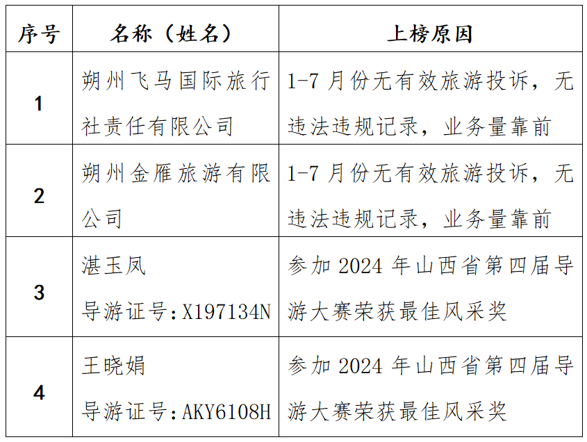 为进一步加强和规范旅行社市场经营行为,鼓励旅行社诚信经营,警示违法行为,朔州市广东会按照《朔州市旅行社、分社及导游“红黑榜”制度》,对列入“红黑榜”的旅行社、分社和导游信息进行对外公示,名单公布如下: